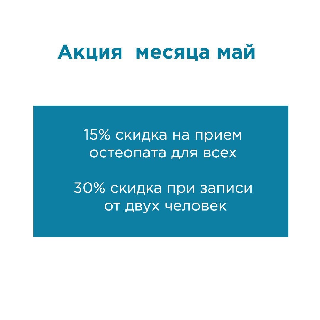 По этой же причине решили продлить акцию прошлого месяца еще и в мае. Многие хотели, но не успели из-за работы и других забот. А сейчас все условия, чтобы семьей сходить к остеопату и подлечиться.