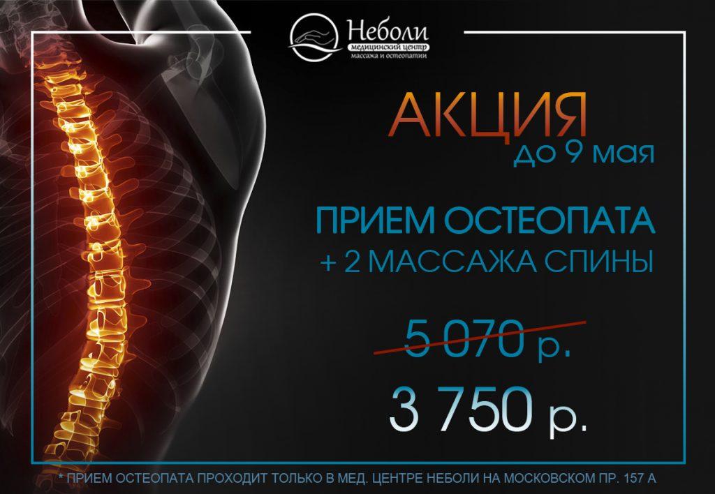 До 9 мая акция «Формула здоровой спины» — прием остеопата + 2 массажа спины = 3750 руб. (вместо 5 070 руб)!