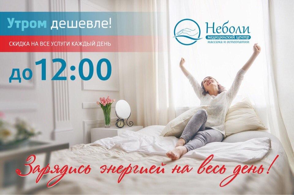 Ведь, все услуги в «Неболи» , проводимые до 12:00, предоставляются со скидкой.