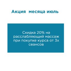ПодробнееВесь июнь ОБЩИЙ МАССАЖ по акционной цене. СКИДКА 10% на любое количество сеансов 60 и 90 минут. 60 минут – 2340...